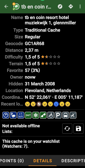 Nadat je een cache item hebt geopend, kun je naar links en rechts vegen om meer informatie over de cache te bekijken (bijv cache omschrijving, extra waypoints, logboek,etc.). Lees de details tekst en schenk aandacht aan de D/T-waardering* en de attributen om meer te weten te komen over hoe deze cache gevonden en gelogd kan worden.