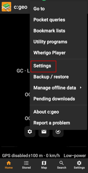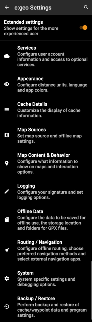 :!: Als je hier iets wijzigt, kan dit leiden tot ongewenst gedrag of werkt c:geo niet meer. Gebruik dit dus alleen op uitdrukkelijk verzoek van c:geo support!
